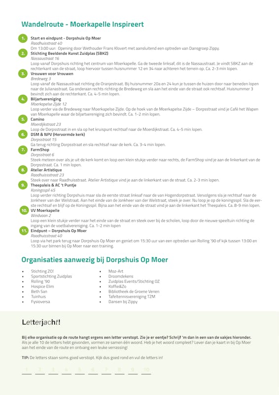 Moerkapelle bruist van de mooie organisaties en initiatieven. Om dat te laten zien openen zij op 27 september hun deuren voor inwoners. De wethouder zal om 13.00 uur het evenement feestelijk openen. Daarna wandelen deelnemers een route van ongeveer 4,5 kilometer door het dorp. Op verschillende plekken langs de route laten organisaties uit het dorp zien wat zij doen. Voor kinderen is er een leuke letterjacht tijdens de wandeling. De wandelroute start en eindigt bij Dorpshuis Op Moer, Raadhuisstraat 40. Je kunt tussen 13.00 en 16.00 uur beginnen met de wandeling; je hoeft dus niet precies om 13.00 uur te starten. Bij Op Moer zijn optredens van onder andere rolschaatsers Rolling 90.