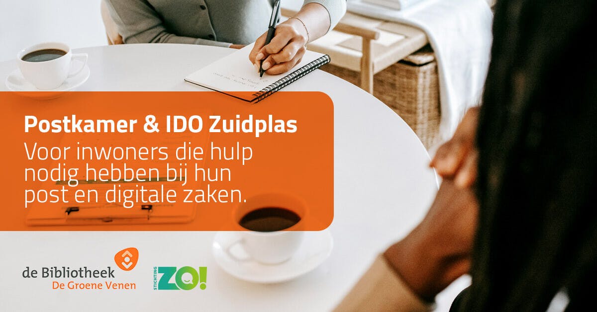 Brieven en formulieren zijn soms moeilijk te begrijpen. Sommige mensen kunnen niet goed lezen of spreken de taal nog niet goed. Anderen vinden het lastig om zelf dingen aan te vragen. Daarom gaan de Postkamer van Stichting ZO!, het Informatiepunt Digitale Overheid (IDO) van de Bibliotheek De Groene Venen en de muziekschool MOZ-Art samenwerken in een gezamenlijk inlooppunt. Alles samen in één gebouw voor makkelijke hulp bij post en regelzaken. In de Postkamer & IDO helpen zowel vrijwilligers als medewerkers van Stichting ZO! en de Bibliotheek. Inwoners uit alle dorpen van Zuidplas kunnen vrij binnenlopen of een afspraak maken.