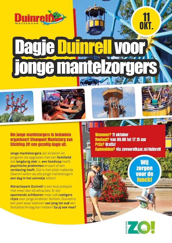 Om jonge mantelzorgers te bedanken en te waarderen organiseert Steunpunt Mantelzorg van Stichting ZO! een gezellig dagje uit. Op zaterdag 11 oktober van 9.00 tot 17.15 uur gaan jonge mantelzorgers naar attractiepark Duinrell in Wassenaar. Deelname is gratis voor alle jonge mantelzorgers tussen de 6 en 20 jaar uit Zuidplas. Aanmelden kan tot en met woensdag 1 oktober via Zovoorelkaar.nl/duinrell.