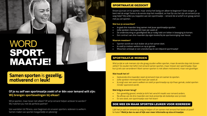 Wil je sporten, maar liever niet alleen? Of wil je iemand helpen actiever te worden? Wij matchen jou met de perfecte partner! Bekijk de flyer hieronder.