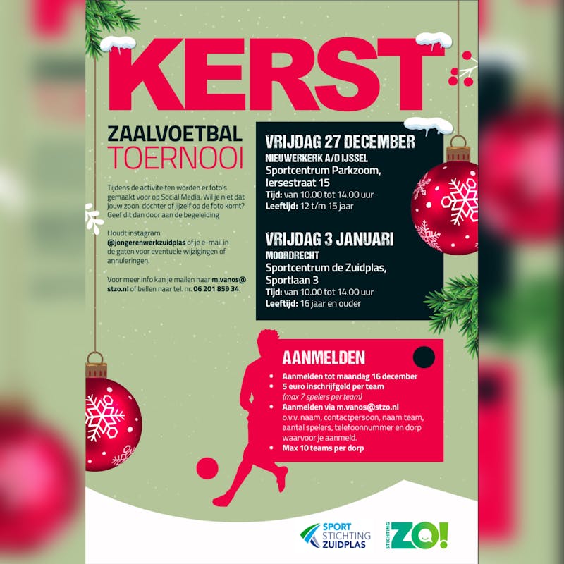 Ben jij 16 jaar of ouder en vind je het leuk om met je vrienden te voetballen? Kom dan gezellig meedoen met het kerstzaalvoetbaltoernooi op 3 januari in Moordrecht! Meld je aan als team van minimaal 5 spelers en maximaal 7 spelers.