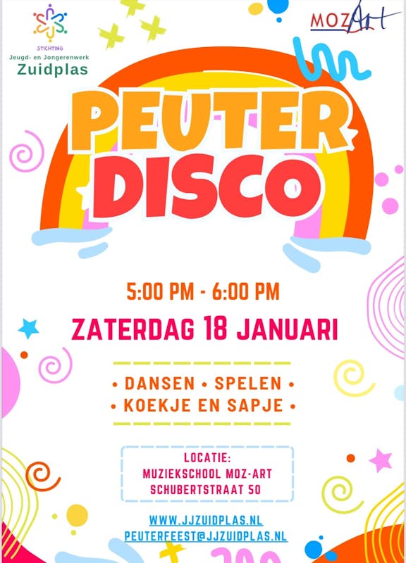 Dit bijzondere feestje is dé kans om samen met je peuter (tot 6 jaar) te genieten van een uur vol muziek, plezier en gezelligheid. Het wordt een feestelijke start, georganiseerd door de nieuwe stichting Jeugd- en Jongerenwerk Zuidplas.