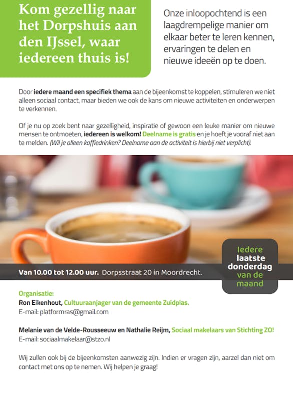 Deelname is gratis en je hoeft je niet vooraf aan te melden. (Wil je alleen koffiedrinken? Deelname aan de activiteit is hierbij niet verplicht)