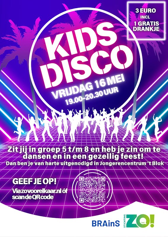 Zit je in groep 5,6,7, of 8 meld je dan aan voor de kidsdisco!