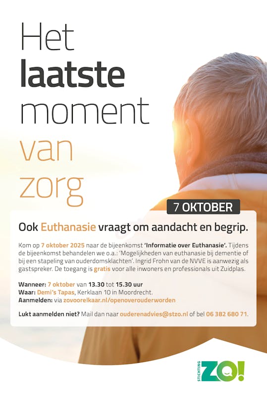 Open over ouder worden, dat vinden we bij Stichting ZO! heel belangrijk. Daarom organiseren Steunpunt Mantelzorg en Ouderenadvies bijeenkomsten over ouder worden. Op 7 oktober is er een informatieve lezing over euthanasie bij meerdere ouderdomsklachten of dementie.