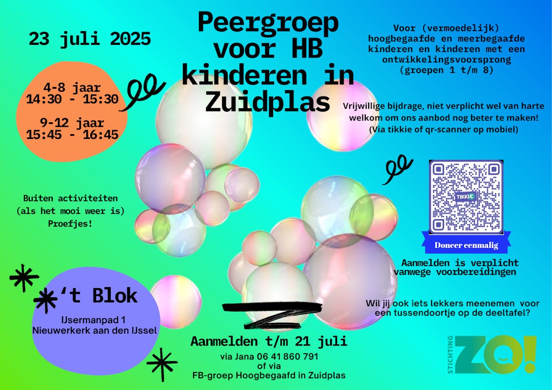 Ouderinitiatief, één keer per maand een middag met activiteiten voor kinderen/jongeren die hoogbegaafd of meerbegaafd zijn. Uiteraard om......