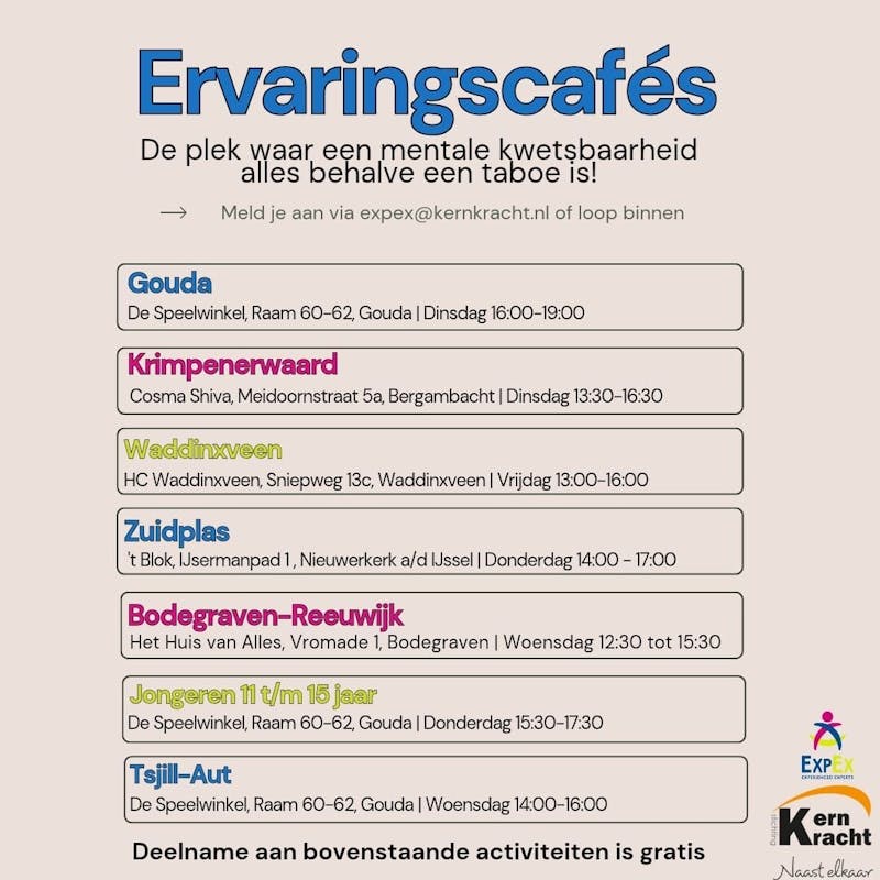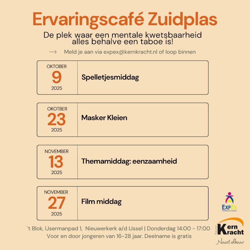 Het Ervaringscafé is dé plek waar jongeren zich veilig voelen en zichzelf kunnen zijn. Op deze plek kun je andere jongeren ontmoeten en kun je jouw ervaringen delen met lotgenoten en ervaringsdeskundigen. Samen is hierbij het kernwoord; zoals samen koken, samen eten, samen muziek maken en luisteren, samen spelletjes spelen, maar vooral samen zijn.