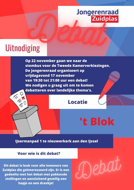 Jongerenraad Zuidplas organiseert vrijdagavond 17 november van 19.30 - 21.00 uur een debat in jongerencentrum 't Blok.