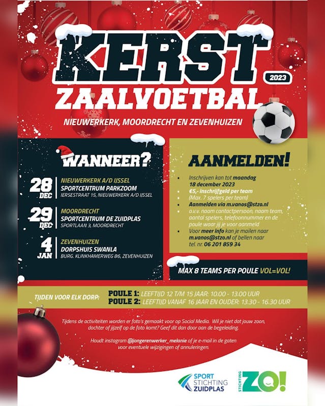 Kom je gezellig meedoen met het kerstzaalvoetbaltoernooi op 29 december in Moordrecht? Meld je aan als team van minimaal 5 spelers en maximaal 7 spelers.