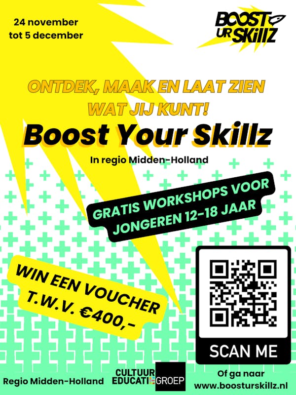 Van 24 november tot 5 december 2025 barst in de regio Midden-Holland de creativiteit los tijdens Boost Your Skillz! Jongeren van 12 t/m 18 jaar kunnen in deze periode gratis meedoen aan toffe workshops om hun talent te ontdekken, te voelen en vooral te laten zien!