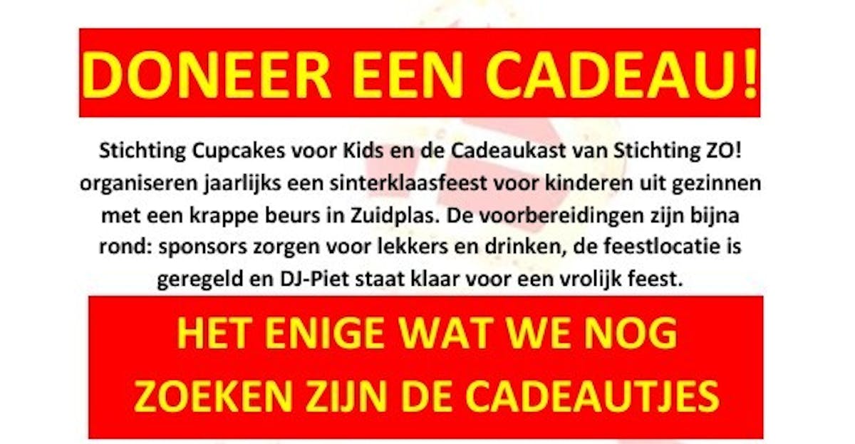 Dit jaar organiseren Stichting Cupcakes voor Kids en de Cadeaukast (Stichting ZO!) opnieuw een Sinterklaasfeest voor kinderen uit gezinnen met een beperkt budget. Dankzij onze sponsors is er al gezorgd voor drinken, iets lekkers en een feestlocatie, en ook komt er een DJ Piet om het feest helemaal compleet te maken.