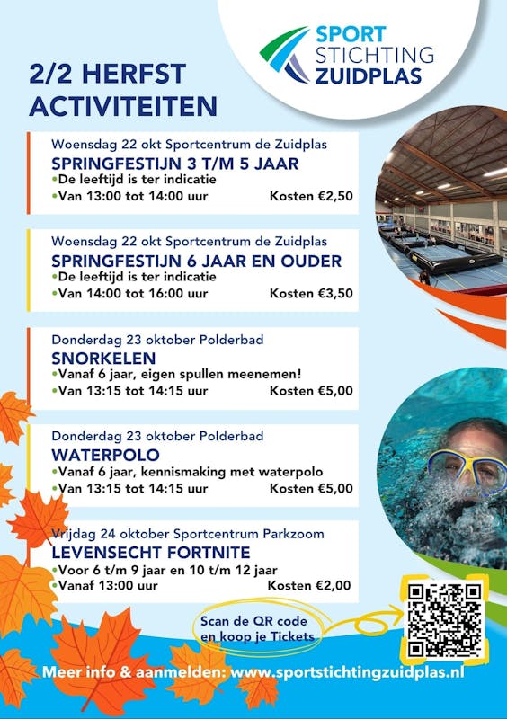 Avonturiers, waterratten en springfanaten kunnen hun hart ophalen, want in de herfstvakantie staat een programma boordevol actie klaar. Van een stoere waterpolo clinic en snorkelavontuur tot de vloer-is-lava, levensecht Fortnite en het bekende springfestijn. Ook deze vakantie is er een prikkelarme variant van het springfestijn.