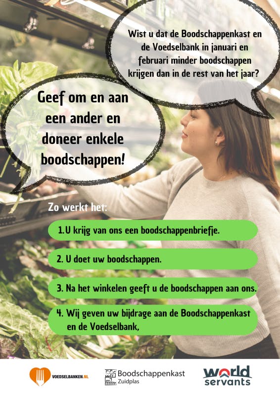 Elk jaar blijkt dat de Boodschappenkast en de Voedselbank in januari en februari minder levensmiddelen krijgen aangereikt dan op andere momenten in het jaar. Dat bracht de actiegroep World Servants Nieuwerkerk aan den IJssel ertoe op vrijdag 10 januari actie te gaan voeren in de winkelcentra in Nieuwerkerk.