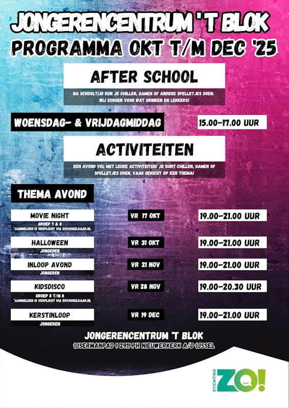 Voor de maanden oktober t/m december heeft Jongerenwerk van Stichting ZO! een leuke planning voor jongeren uit Zuidplas.